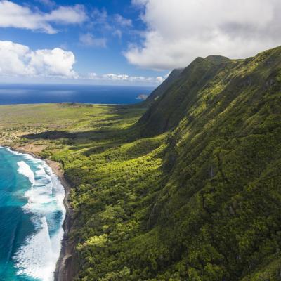 ハワイで5番目の大きさのこの島は、全長61km、幅は広い所でもわずか16km。北東の海岸には高さ1,100~1,200mもの世界最大の岸壁があり、南部の沖合にはハワイ最長のサンゴ礁が約45kmに渡って広がります。カラウパパ国立歴史公園を目指し崖に沿ってハイキングしたり、ハワイ最大の砂浜パポハク・ビーチでのんびりしたり。また、サイクリングや4WDでのドライブなど、アウトドア・アドベンチャーを楽しめる島です。