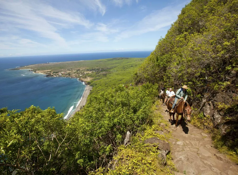 世界で最も落差のある崖、高さ約1200mのノースショア・パリを見ながらラバでゆっくりと下る細道。カラウパパ半島までの約4.6kmの道のりは景色が素晴らしく、大自然を満喫できます。その道の先にある、カラウパパ国立歴史公園。かつて、ハワイで最も人里離れた町があったこの地には、深い歴史が眠っています。