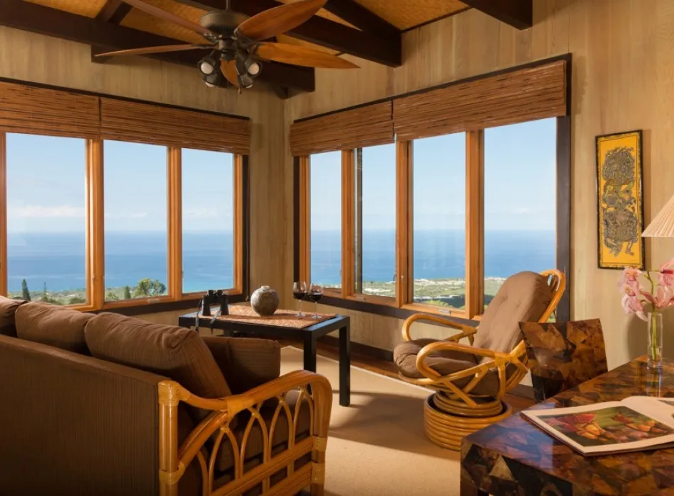Private nooks and cozy corners abound across our two-story Kona Coffee Country retreat, featuring a rooftop gazebo, pool, hot tub, wood-burning fireplace, kitchenette, and an open-air massage hale for couples to enjoy. From sunrise to sunset, every angle reveals the beauty of the Kona Coast.