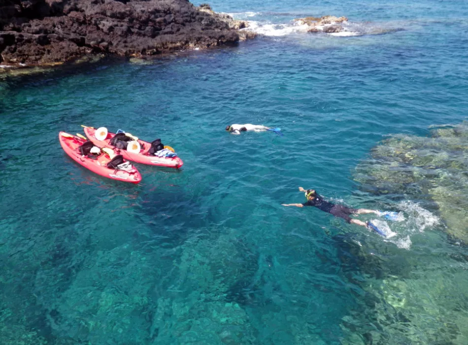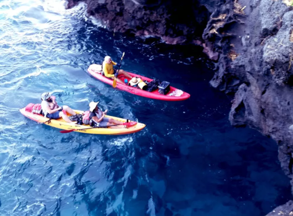 Hawaiʻi Guided Kayak Tours (2-4hr) to incredible places along the west coast of the Big Island of Hawaii. Kayak and snorkel among coral teeming with colorful tropical fish in crystal clear waters with clarity over 50ft. Very small groups offering dolphin watching, turtle cleaning station, cliff jumping, sea caves, and more. Family friendly tours full of FUN!